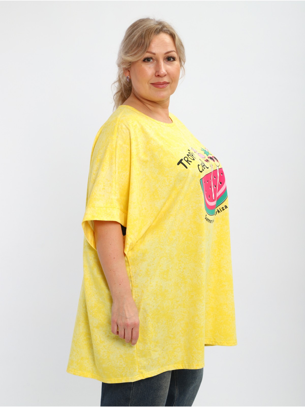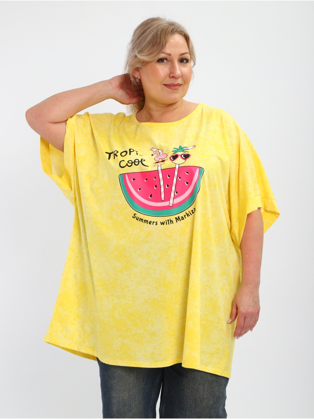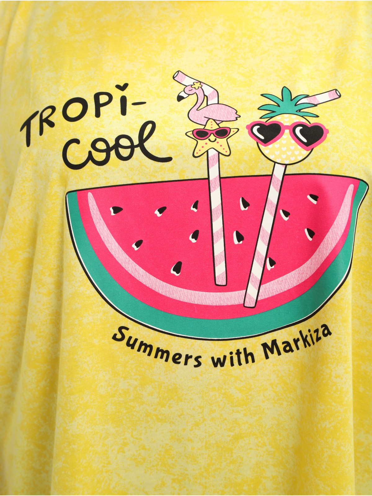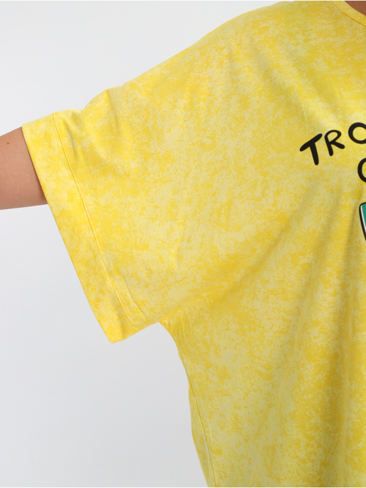 Короткий цельнокроеный рукав с обтачкой обеспечивает удобную посадку, а яркий принт на груди добавит образу изюминку.