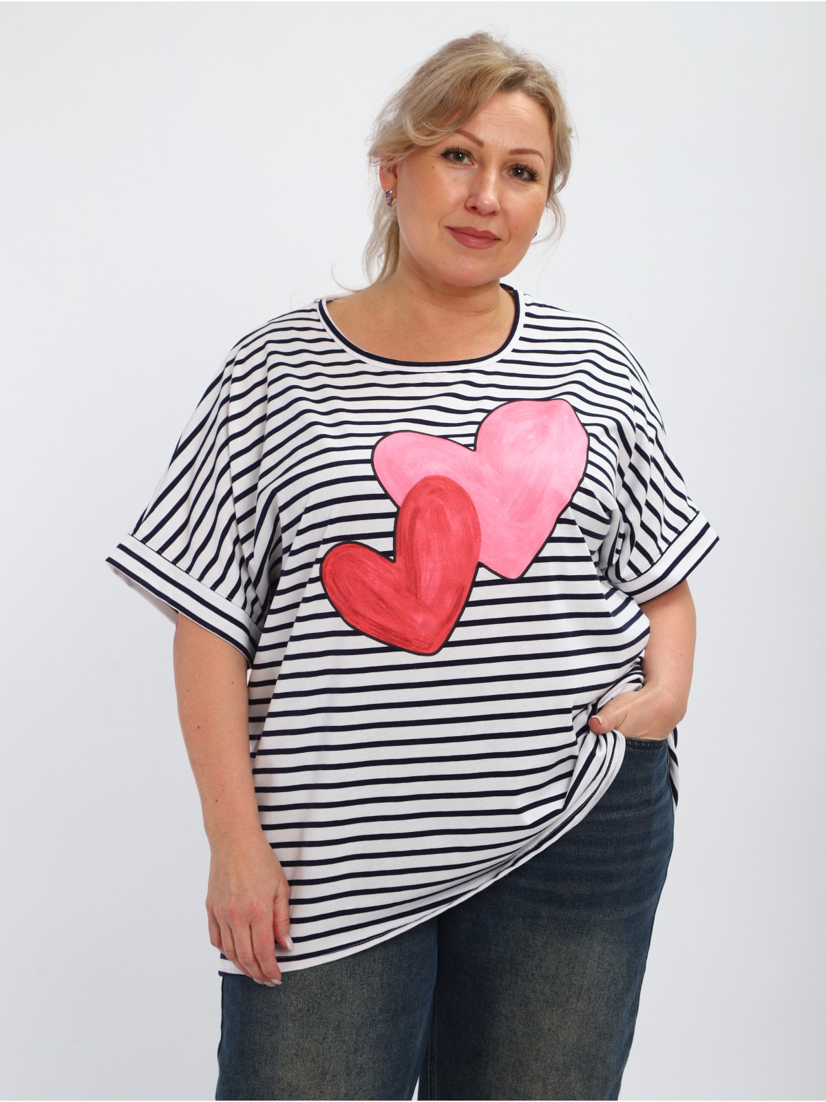 Хлопковая футболка размера с коротким рукавом и принтом на груди — базовый элемент гардероба.