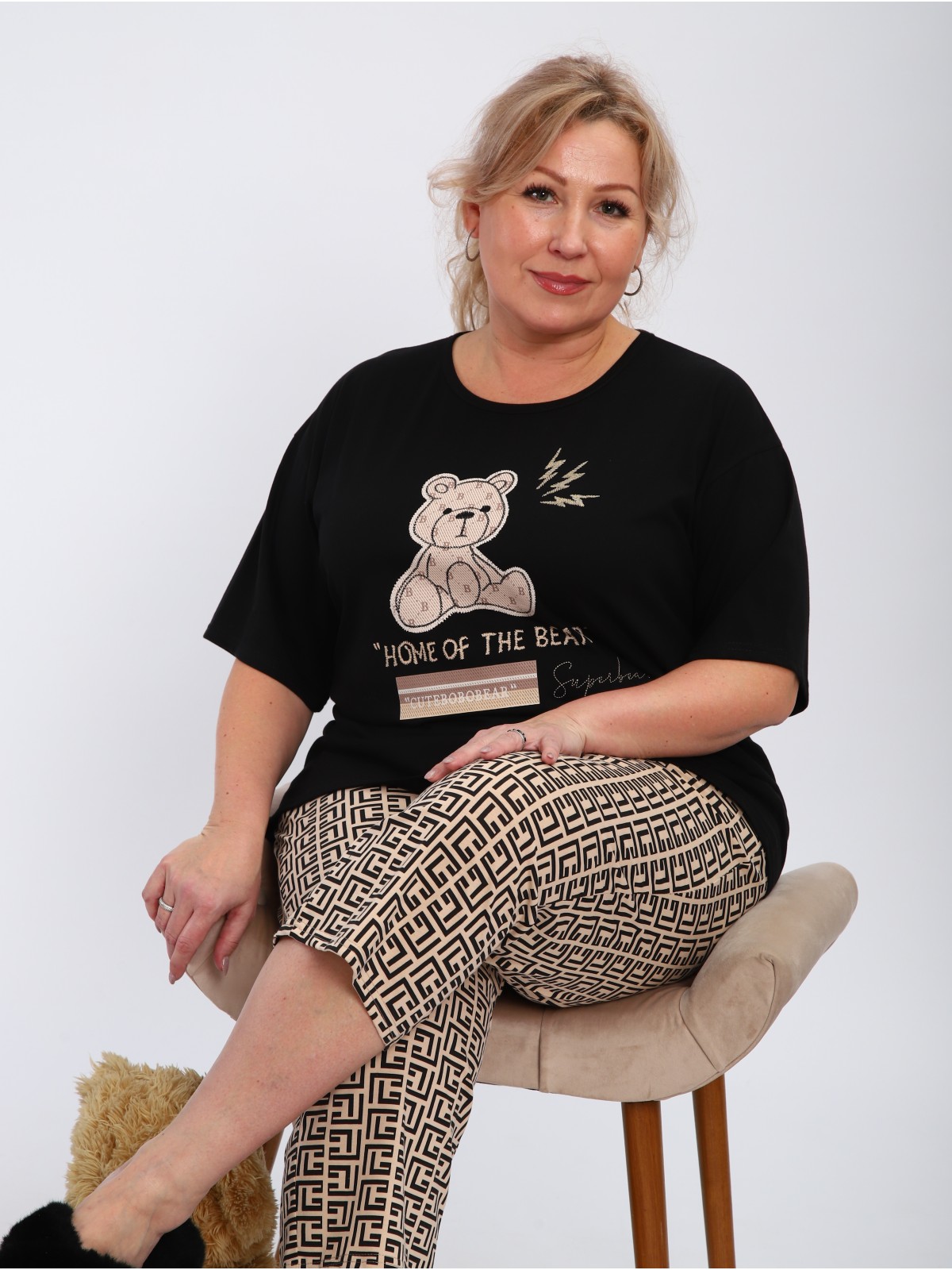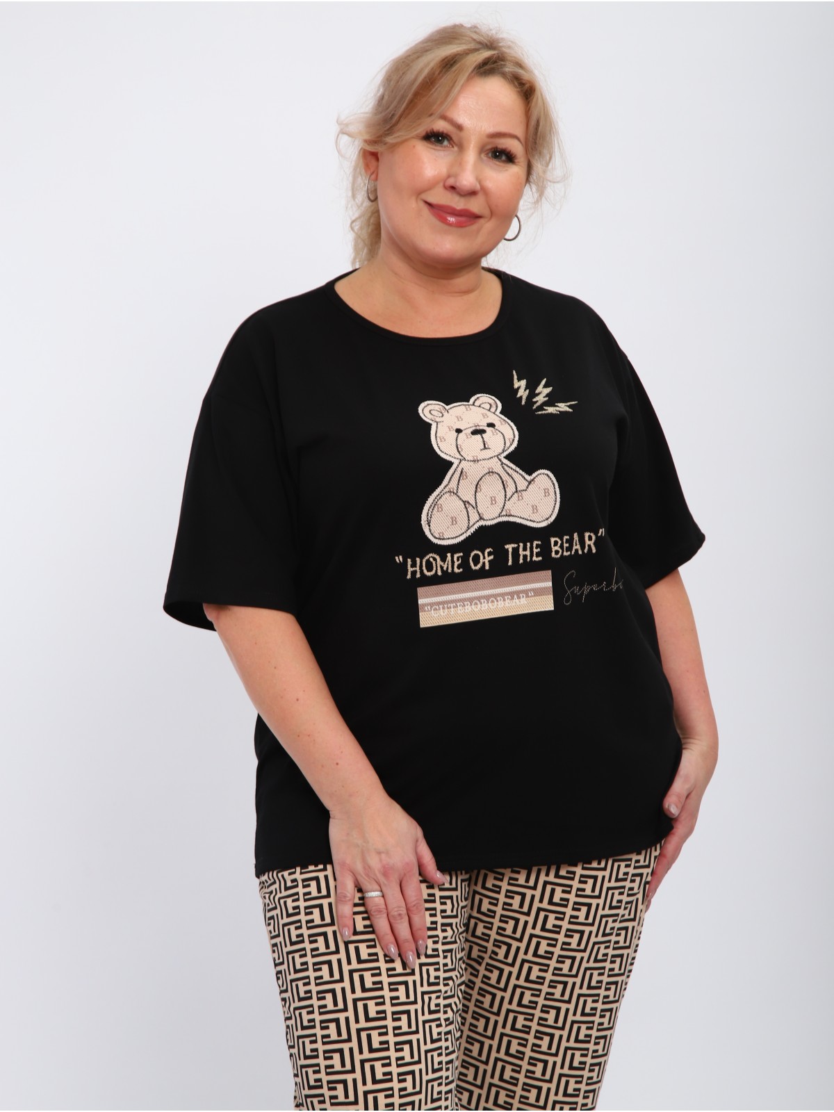 Эта стильная женская пижама состоит из футболки с оригинальной печатью и бриджей. Идеальный выбор для комфортного сна и отдыха.