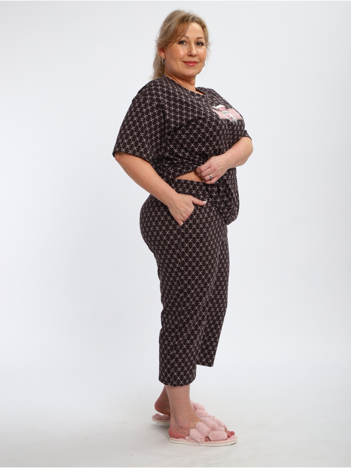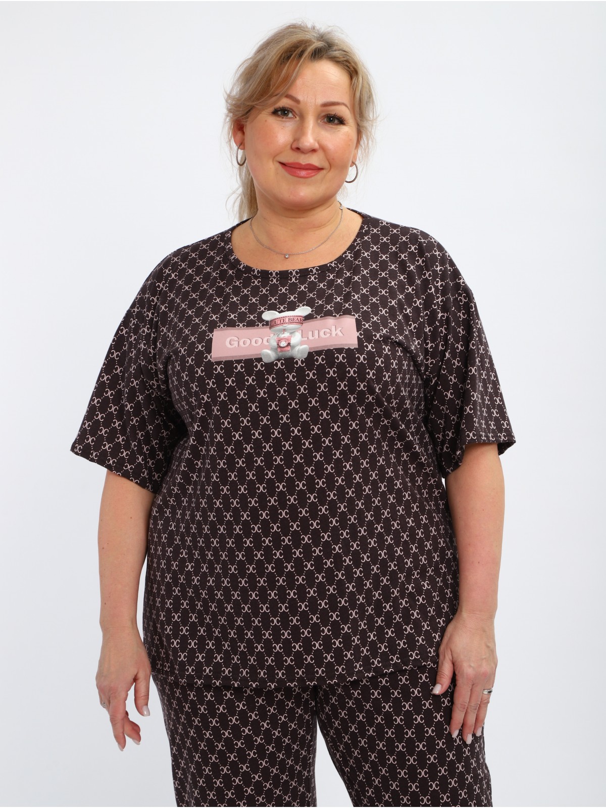 Эта стильная женская пижама состоит из футболки с оригинальной печатью и бриджей. Идеальный выбор для комфортного сна и отдыха.