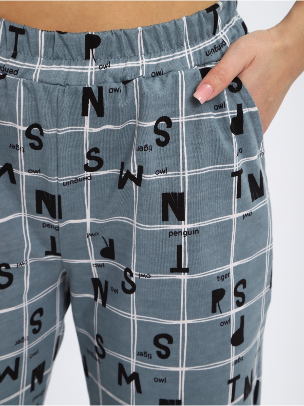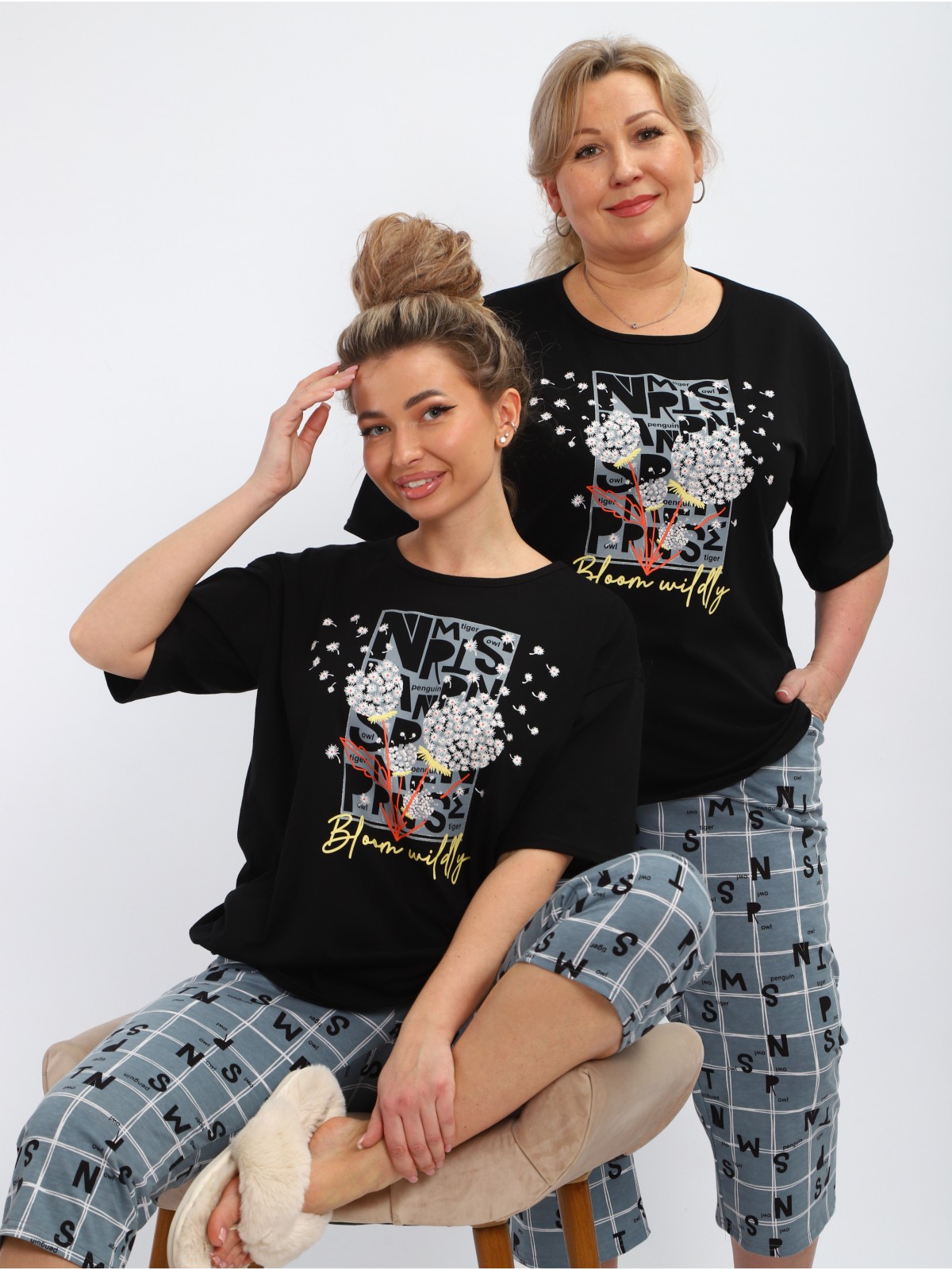 Эта стильная женская пижама состоит из футболки с оригинальной печатью и бриджей. Идеальный выбор для комфортного сна и отдыха.
