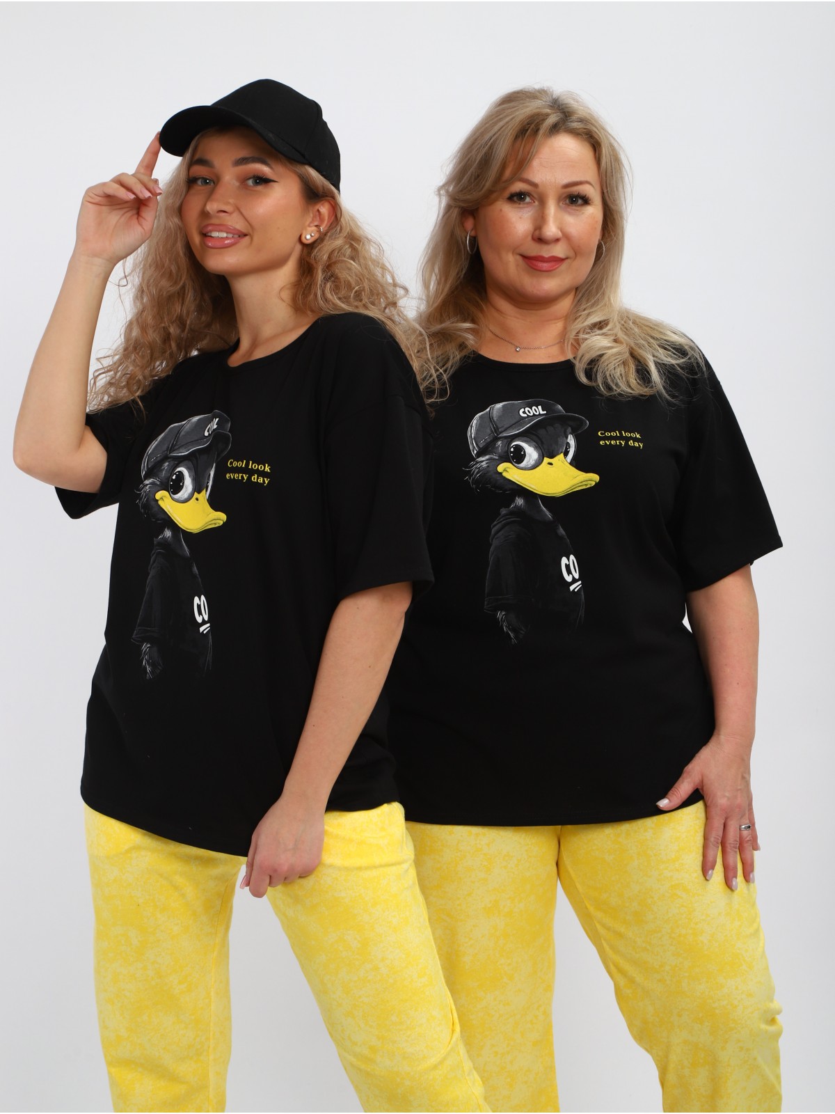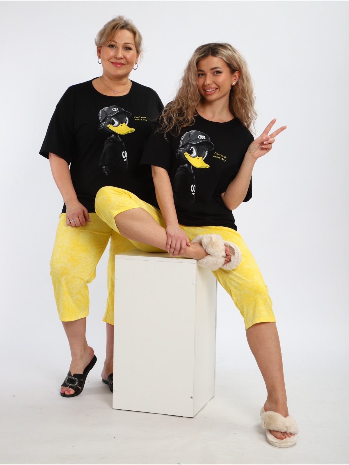 Эта стильная женская пижама состоит из футболки с оригинальной печатью и бриджей. Идеальный выбор для комфортного сна и отдыха.